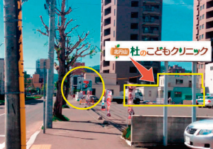 北9条と北10条の間の通りをひたすら進み、西松屋さんのある交差点を左に曲がるとすぐクリニックが見えます。